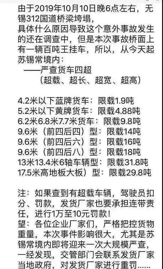 另外一個原因是由于市場競爭因素,現有的重載貨車如果不超載很難盈利。這在如今去產能、制造業競爭壓力大的情況下,想提高貨運行業的收入杜絕超載現象是非常難的。對于超載貨車罰款后繼續放行,也給橋梁造成了很大的安全隱患。另外一個,大家很感興趣的是這次事故和臺灣近期事故的對比。專家認為,無論是從橋的重要性,還是從暴露問題的嚴重程度,兩者都是不可相提并論的。無錫這次垮塌的橋是一座跨度二十多米的高架簡支梁橋,臺灣是一座140多米的拱橋。前者是一個很普通的工程,相當于一座普通的三層洋房,后者則是一個地區的重點標志工程,肯定是進行了詳細的安全性研究和重點的審查,無錫事故的傷亡更少,事后想要重建也更為容易,重新把梁架上去就好,臺灣的拱橋沒個兩三年無法修復。橋梁側傾問題在國內這些年頻繁發生,因為設計時普遍存在類似缺陷,業界也有心理準備。而臺灣的問題要嚴重得多,是主要受力構件的強度破壞,熟悉土木工程的人應該知道這是一個多么恐怖的概念,因為強度要求是最容易滿足的。連強度要求都無法滿足,這座橋梁的質量問題無法想象。看了上述事故分析,小編也有些懵懂了,在很多城市,市區的道路是不允許大貨車通行或者限制時段通行的。這些大貨車是如何開上市區道路的?行進在橋梁之上的呢?超載事故頻發, 兩個月造成41人死亡,57人受傷近期因道路交通事故頻發,各區域都在有針對性的進行超限的治理。水泥物流更是從源頭就加大了治超的力度。“百噸王”們是如何走出廠門又堂而皇之的上了路的呢?近期多起道路交通事故都是源于貨車超載,查超治超由來已久,為何屢禁不止呢?在剛剛過去的不到兩個月的時間內已經連續發生多起營運客貨車事故,共造成41人死亡57人受傷。血淋淋的數字,與其說是車禍猛如虎,不如說都是超載惹的禍!9月3日16時許,一輛豫QE3683號重型牽引半掛車沿S220省道行駛至河南省駐馬店市驛城區一路口時,與一輛電動三輪車相撞,造成電動三輪車上6人全部死亡。9月7日16時許,一輛云L81765號重型自卸貨車行駛至云南省大理市挖色鎮老環海公路新村路段時,制動失效導致車輛失控并撞到路邊建筑及行人,造成5人死亡。9月10日2時許,一輛甘AV5095號貨車行駛至甘肅省甘南州卓尼縣巴哇鎮路段時,車輛駛出路面沖進路邊民房,造成6人死亡(含2名小學生、2名幼兒園兒童)、4人受傷。9月10日9時許,一輛吉H76716號中型客車途經吉林省延邊市琿春市英安鎮去往大荒溝村公路一處彎道時發生側翻,造成5人死亡、24人受傷。9月15日13時許,一輛桂CL0671號中型客車沿原314線行駛至廣西自治區桂林市全州縣才灣鎮路段時發生側翻,造成3人死亡、11人受傷。9月22日,湖南省湘潭市湘潭縣花石鎮日華街上發生一起重大交通事故。一輛自卸低速貨車撞到多名趕集的行人。造成10人死亡,16人受傷。事故原因已初步查明,系自卸低速貨車(核定載質量1490kg)嚴重超載,車輛經過急轉彎長下坡路段時突然剎車失靈所致。10月2日20時40分許,遼寧葫蘆島綏中縣一輛小型面包車與一輛遼PA8373重型自卸貨車相撞,導致面包車內6人當場死亡,2人重傷。事故發生后遼寧省交通管理局召開緊急視頻會議。要求從10月8日起至10月28日,各地自行組織重點查處“百噸王”和超載超速、拼裝改型的大貨車,要求有數量、見效果。