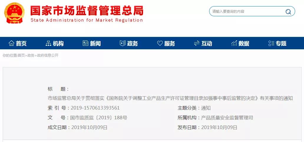2019年9月18日,國務(wù)院印發(fā)《關(guān)于調(diào)整工業(yè)產(chǎn)品生產(chǎn)許可證管理目錄加強(qiáng)事中事后監(jiān)管的決定》(國發(fā)〔2019〕19號(hào),以下簡稱國務(wù)院《決定》),對(duì)工業(yè)產(chǎn)品生產(chǎn)許可證制度改革作出重要部署。全國市場(chǎng)監(jiān)管系統(tǒng)要進(jìn)一步提高思想認(rèn)識(shí),深刻理解生產(chǎn)許可證制度改革的重要意義,準(zhǔn)確把握國務(wù)院決策部署,堅(jiān)決落實(shí)各項(xiàng)改革任務(wù)。為貫徹落實(shí)好國務(wù)院《決定》,現(xiàn)就有關(guān)事項(xiàng)通知如下: