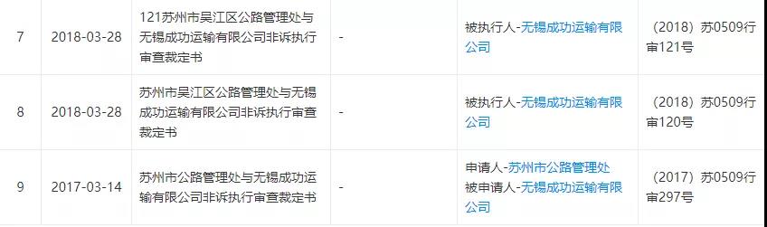 據公開信息顯示,從2017年至2019年近3年時間內,無錫成功運輸有限公司至少涉及9起法律訴訟。案由涵蓋“機動車交通事故責任糾紛”“違反《公路安全保護條例》第六十四條”等。