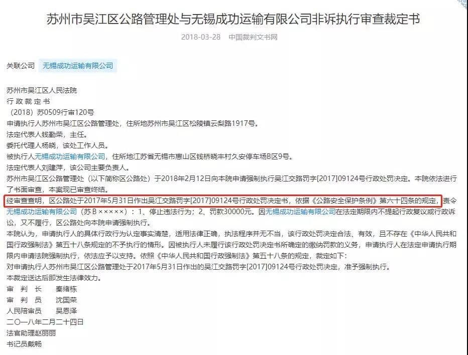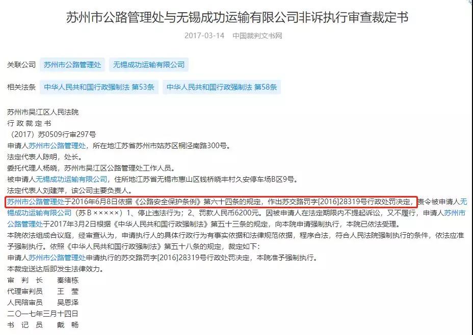 其中,在2016年6月8日至2017年5月31日期間,由于違反《公路安全保護條例》第六十四條,被蘇州市吳江區公路管理局審查裁定。