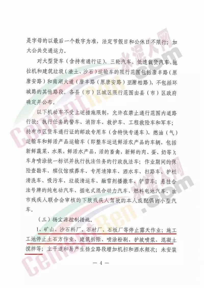 一、全面落實應急響應減排措施工業源停限產措施一樣面要求水泥行業(特種水泥除外),泥制品、粉磨站停產;水泥熟料生產線停產;協同處置城市生活垃圾或危險廢物的企業,日處理生活垃圾與污泥總量低于400噸(含)、處理有毒有害廢棄物總量低于熟料產能4%(含)的生產線,停產。