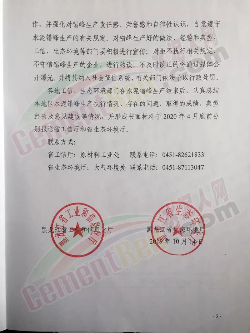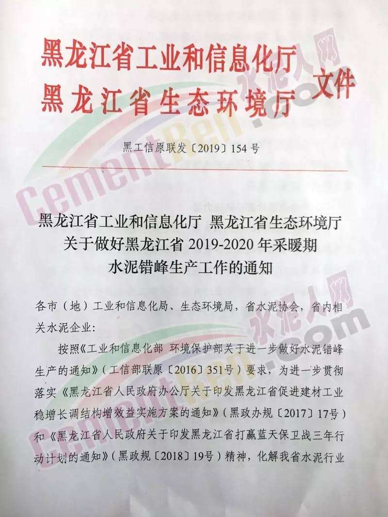 日前,黑龍江工信廳聯合生態環境廳聯合發布《關于做好黑龍江省2019-2020年采暖期水泥錯峰生產工作的通知》稱:按照工信部、環境部關于進一步做好水泥錯峰生產的通知要求,為進一步貫徹落實相關政府文件要求化解黑龍江省水泥行業產能過剩矛盾,合理縮短水泥熟料裝置運轉時間,減輕采暖期大氣污染,決定黑龍江省2019-2020年采暖期繼續開展水泥錯峰生產工業。錯峰生產時間及范圍:2019年10月20日至2020年4月20日在黑龍江全省所有水泥熟料生產企業(含利用電石渣生產熟料的企業)全面實行錯峰生產,其中承擔協同處置城市生活垃圾及有害廢棄物等任務的生產線上可以不進行錯峰生產,應適當降低水泥生產負荷。通知原文如下:
