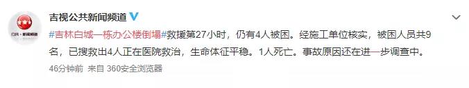 白城市第一時(shí)間組織力量科學(xué)施救,在住建、消防專家指導(dǎo)下,經(jīng)過(guò)晝夜連續(xù)奮戰(zhàn),截至10月15日下午15時(shí)45分左右,9名被困人員全部救出,其中:有4人傷情穩(wěn)定,無(wú)生命危險(xiǎn),有5人已死亡,現(xiàn)場(chǎng)搜救工作已完成。