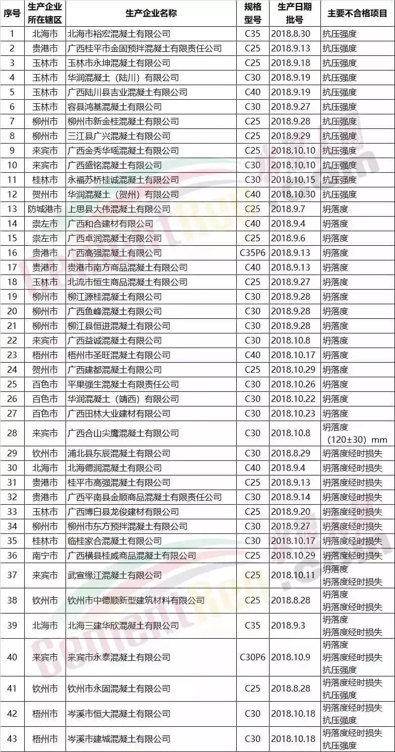 此前,被通報(bào)的部分混凝土企業(yè)產(chǎn)品抽檢不合格名單如下: