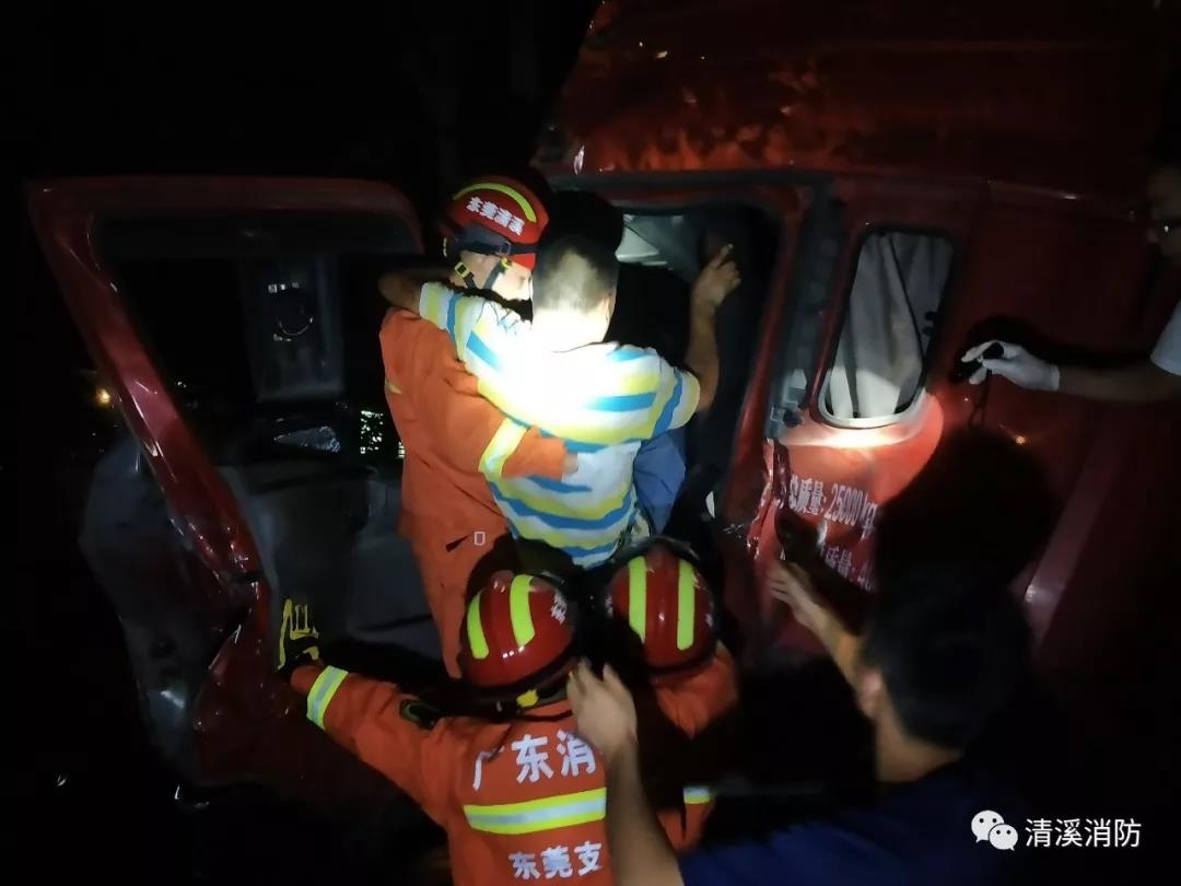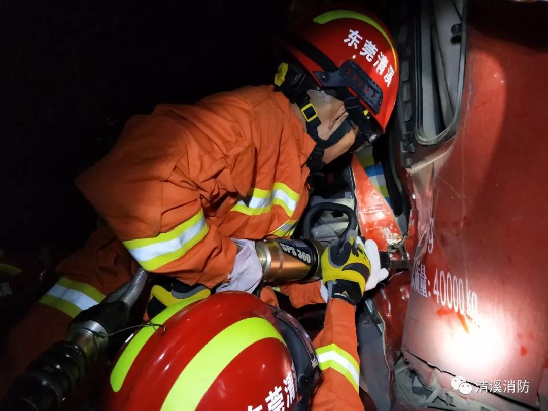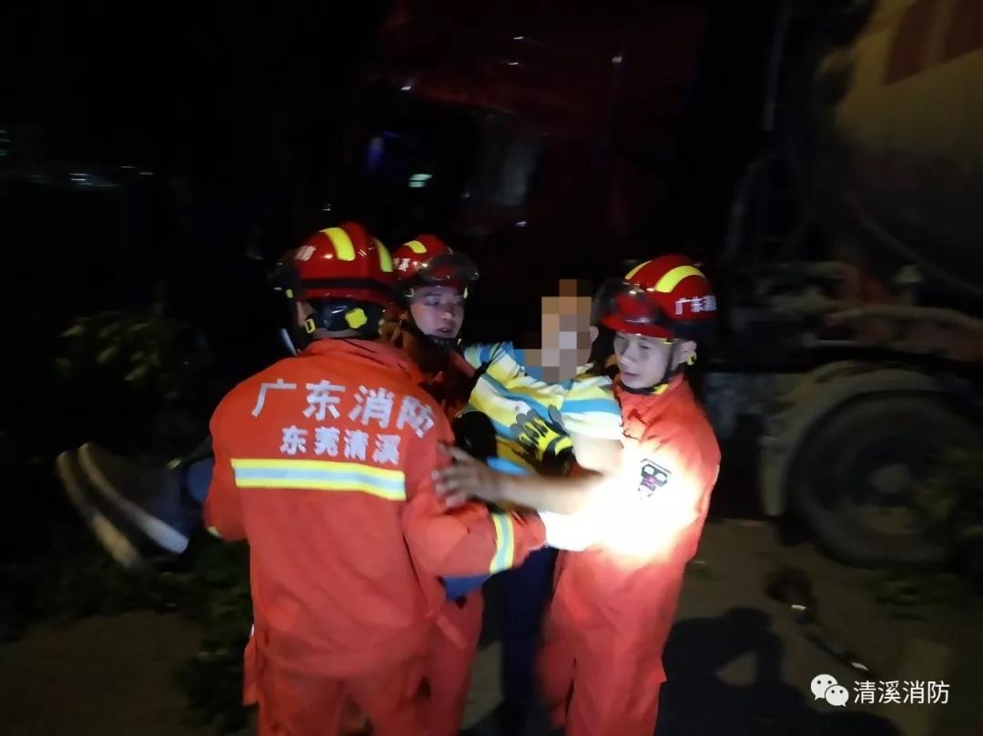 2019年10月15日晚11時41分許,廣東東莞市清溪長山頭水廠門口一輛水泥車與一輛大貨車發生碰撞,水泥車司機被困車內情況緊急。