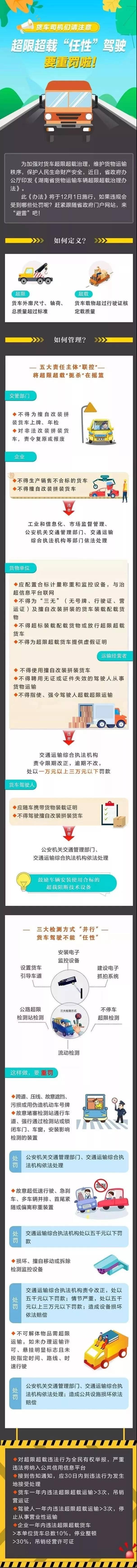 近期,湖南省公布了最新的《湖南省貨物運輸車輛超限超載治理辦法》(以下簡稱《辦法》),明確將從多個方面入手嚴格治理超限超載貨運車輛,并表示將對于違法單位及個人給與嚴厲處罰。據(jù)了解,該《辦法》將于2019年12月1日正式實施。相關要點如下: