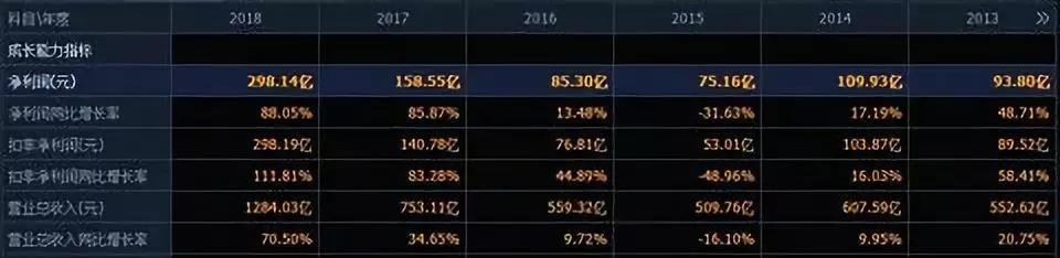 從公司的營收、凈利潤等幾個主要成長能力指標來看,2014至2018年五年間,公司營收分別為607.59億、509.76億、559.32億、753.11億、1284.03億,營收同比增速為9.95%、-16.1%、9.72%、34.65%、70.50%,綜合來看近10年平均營收增速21%,近五年為22%。