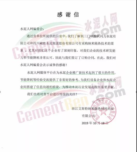 近日,水泥人網收到來自浙江艾斯特納米隔熱材料科技有限公司的一封《感謝信》,為艾斯特納米隔熱材料科技設備企業和水泥企業間搭建了信息溝通的橋梁。 江艾斯特納米隔熱材料科技有限公司表示:水泥人網為水泥企業推廣新技術起到了很大的作用,節能降耗等經驗交流提供了非常好的參考,為推動水泥行業發展起到了重大貢獻。 水泥人網作為水泥行業最大的新媒體平臺,一直在不斷的推動行業發展,為水泥行業豎品牌,為企業辦事的宗旨,致力于服務水泥行業上下游企業,為水泥行業貢獻自己的一番力量。