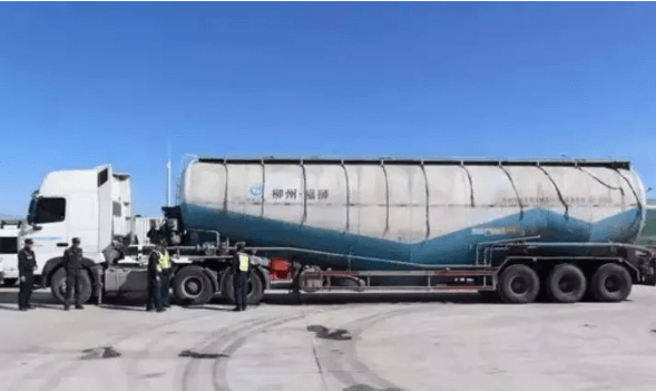 兩輛“百噸王”從廣西柳州市一家水泥廠開出,被廣西柳州市公安局交警支隊鹿寨大隊的民警查獲,經過稱重,車輛號牌為桂C****2的重型半掛牽引車核載質量33.5噸,實載96.2噸,超載187.2%,車輛號牌為桂C****7的重型半掛牽引車核載質量48.8噸,實載125.82噸,超載157.8%,兩車均存在嚴重的交通違法行為。