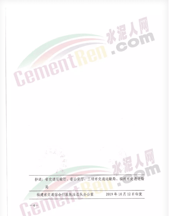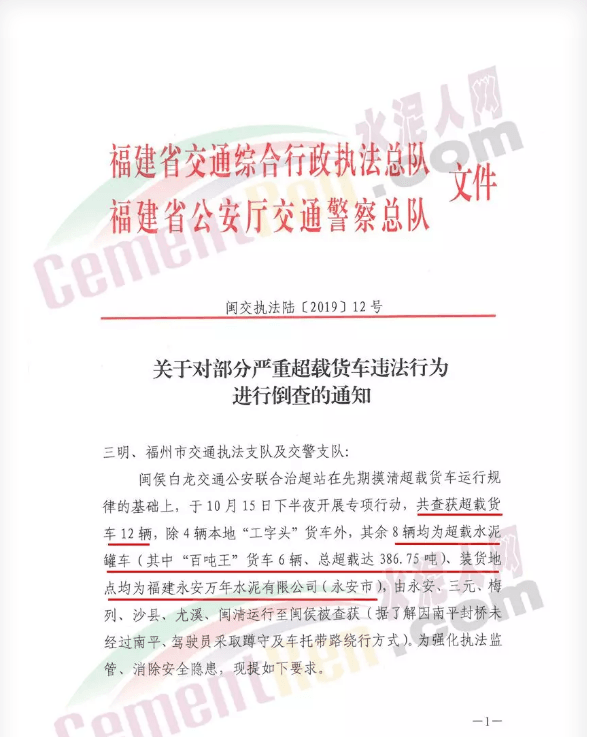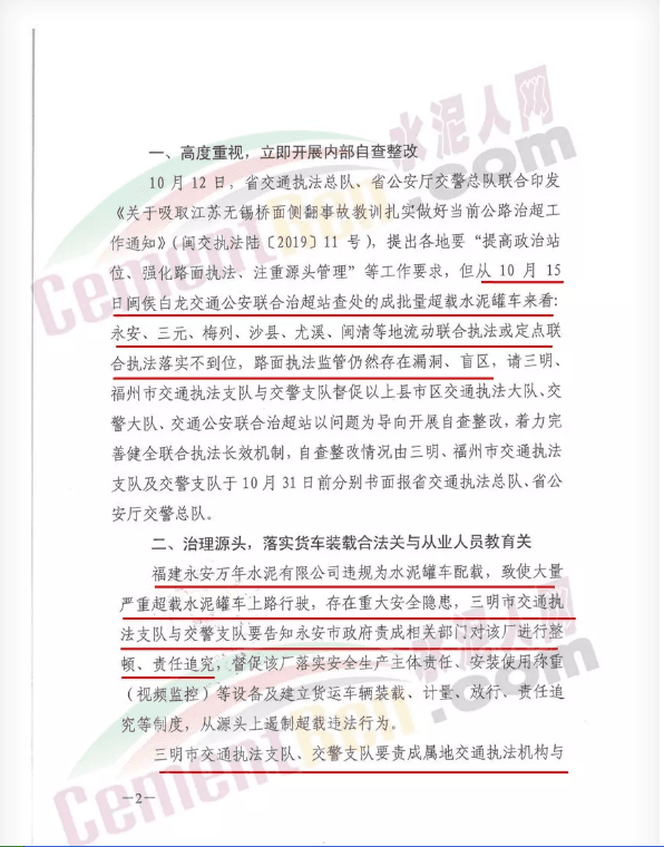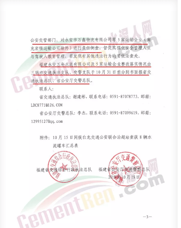 福建永安萬年水泥有限公司及5家運輸企業(yè)整改落實情況由三明市交通執(zhí)法支隊、交警支隊于10月31日前分別書面報省交通執(zhí)法總隊、省公安廳交警總隊。通知原文如下: