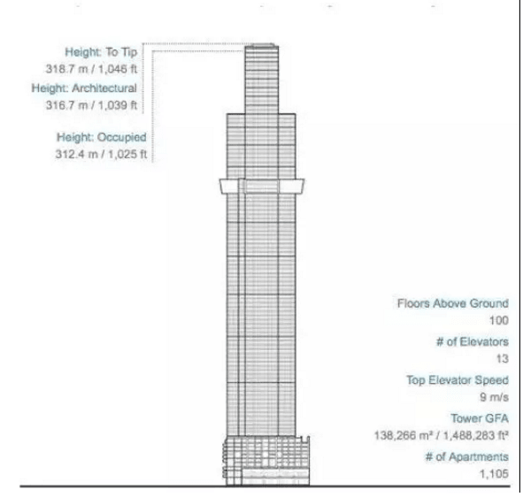 從下圖的Australia 108圖紙,大家可看到,這棟樓有100多層,高318米。向這樣高的大樓內泵送混凝土,需要一直加壓。