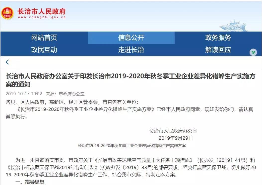 9月29日山西省長治市發布《長治市2019-2020年秋冬季工業企業差異化錯峰生產實施方案》要求水泥企業2019年10月1日00時至2020年3月31日24時之間停窯限產。其中,水泥企業完成無組織治理和特別排放限值改造的限產50%,未完成的停產整治。