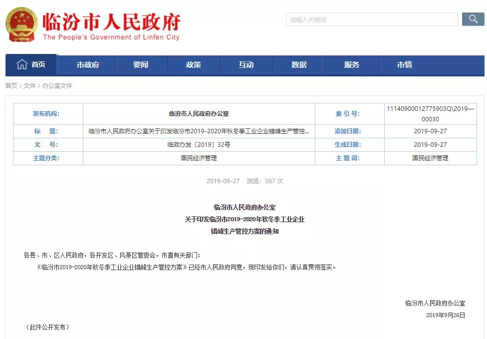 9月26日臨汾市人民政府辦公室印發臨汾市2019-2020年秋冬季工業企業錯峰生產管控方案要求轄區平川縣(市、區)從2019年10月1日—2020年3月31日;山區縣從2019年11月15日—2020年3月15日期間水泥生產等工業企業錯峰生產。