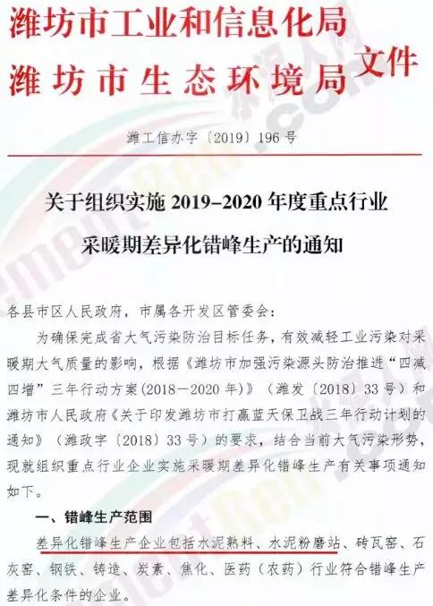 10月10日,山東省濰坊市工信局、生態環境局聯合發布2019-2020年度重點行業采暖期差異化錯峰生產通知要求水泥行業企業(包括水泥熟料、水泥粉磨站等)在采暖期間實施差異化錯峰生產。對行業污染排放績效水平明顯好于同行業其他企業滿綠色標桿企業條件的實施錯峰生產豁免。對水泥企業熟料生產線實施停產,水泥粉磨站限產50%。