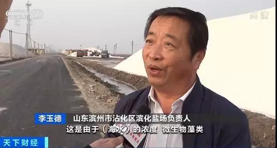 山東省濱州市沾化區濱化鹽場負責人 李玉德:由于海水的濃度、微生物藻類、光線強弱、水的深度,比如有的是20公分,有的是50公分,深度不一樣,所以從上面看起來,顏色也會有一定變化。