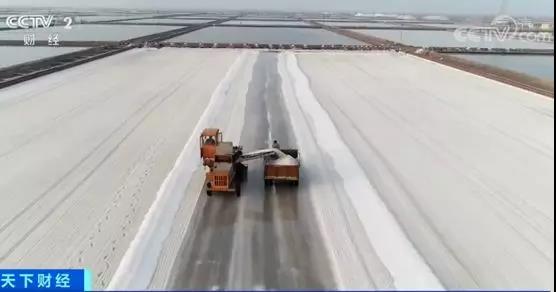 鹽場負責人說,海鹽收獲分為兩個季節,春秋季各一次,每個收獲季都在一個月左右,一般是每年的5月和10月。這家鹽場一共是18萬畝,大家輪班作業,24小時不間斷,采用機組和管道相結合的方式,一個月之內要把鹽全部收完