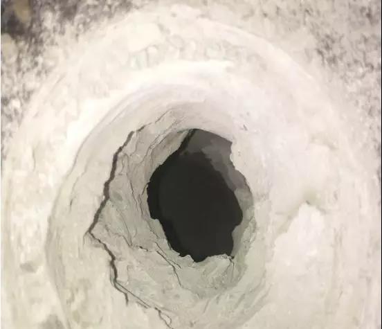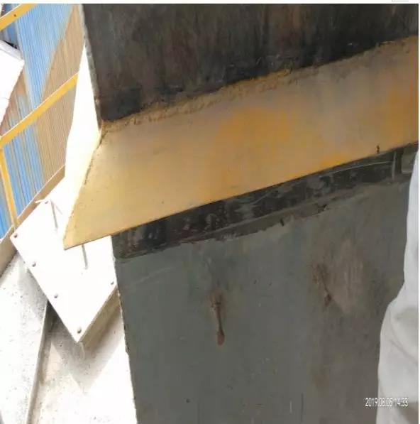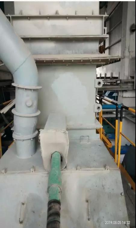 軟連接會出現漏風或密封不嚴從而導致冒灰現象,并且經常出現軟連接位置磨透冒灰,帶來環保問題;軟連接接口處特別容易卡料、積灰,造成軟連接成“硬連接”從而導致倉重不準。另外稱重倉是輥壓機系統物料粉碎、熱交換轉接點,倉內產生蒸氣、粉塵,對倉壁、倉頂粘貼嚴重。(如圖3)