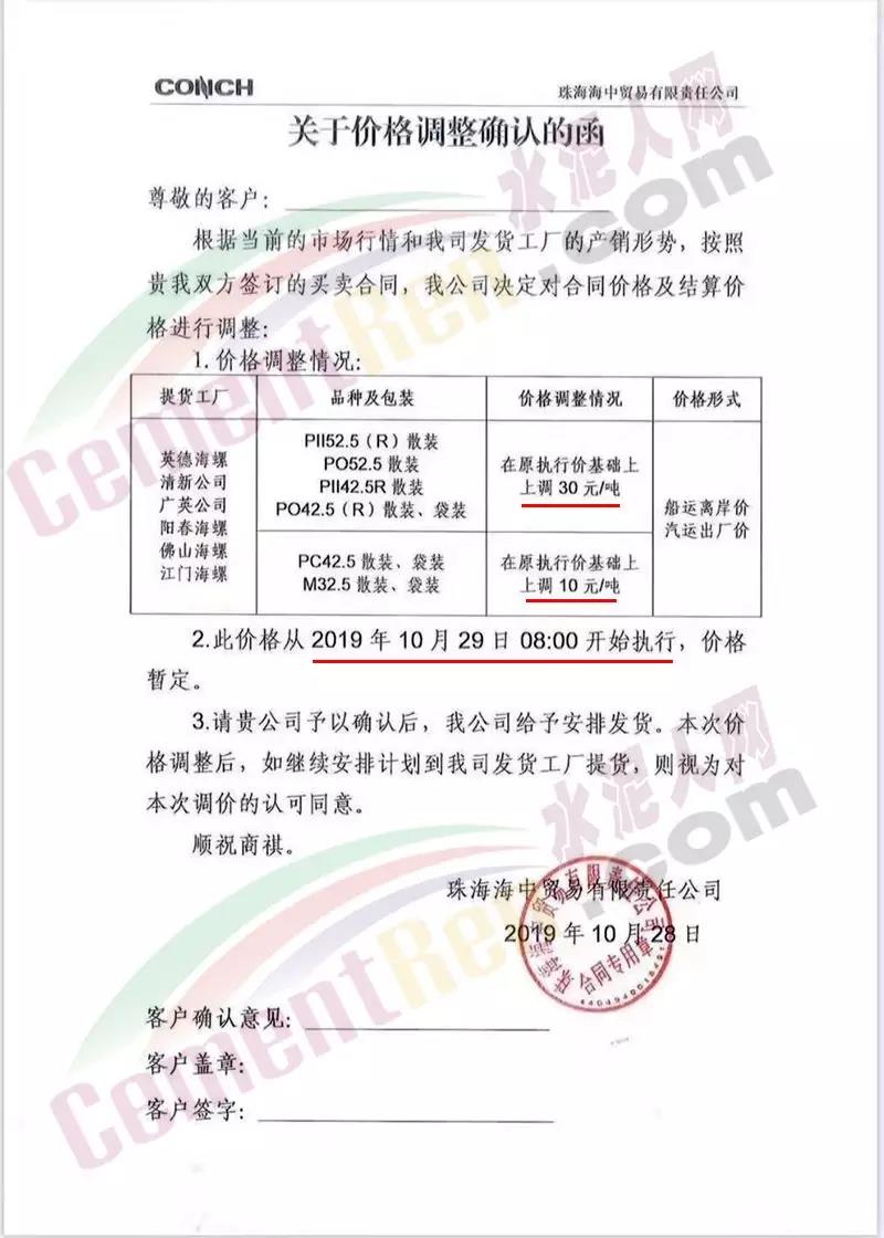 同期,珠海海中貿易有限責任公司發布關于價格調整確認的函稱:根據當前的市場行情和公司發貨工廠的產銷形勢,公司決定對合同價格及結算價格進行調整,新價格從10月29日8點開始執行。