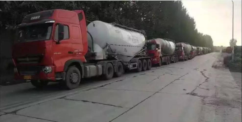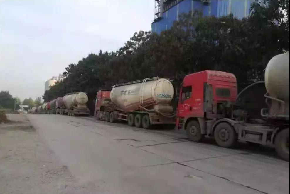 (某大型水泥廠門口排隊等著進廠的罐車)