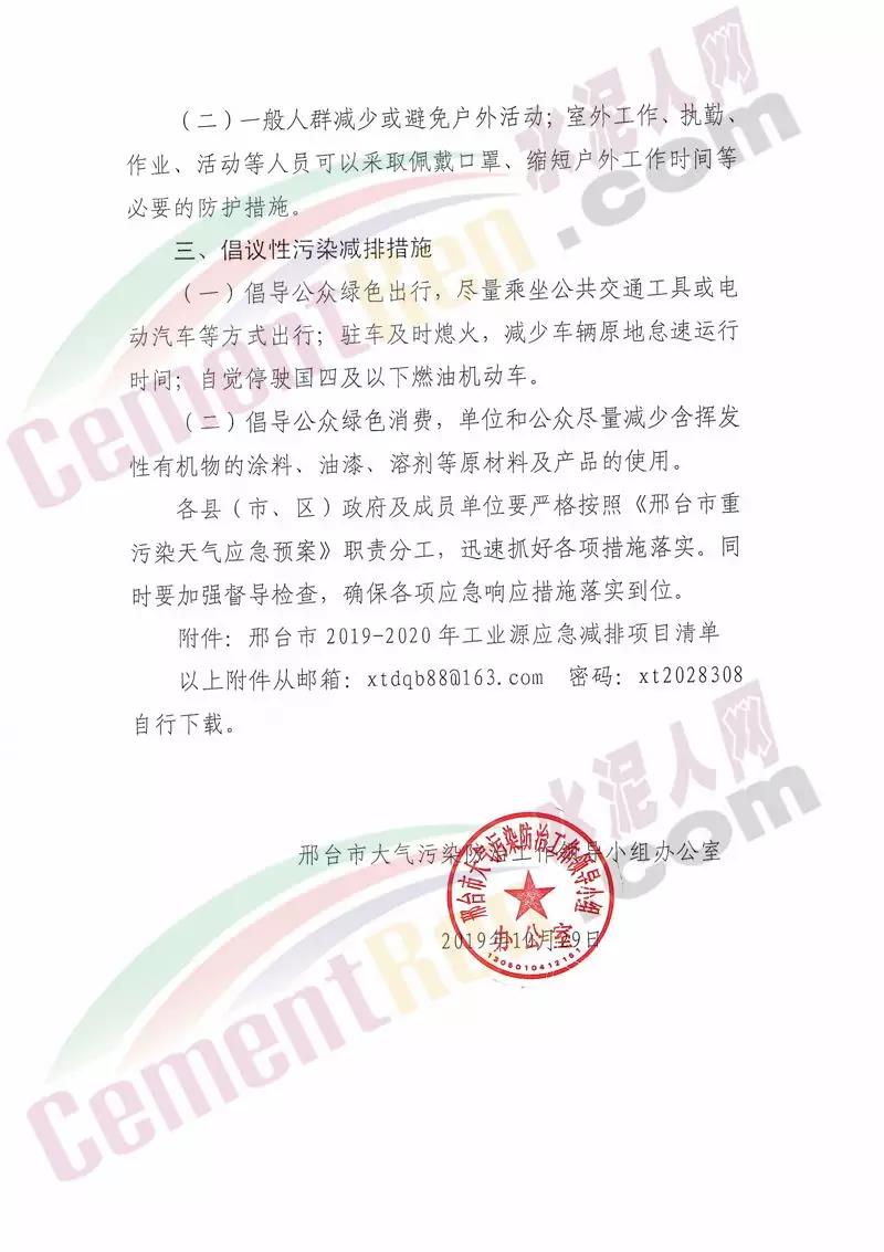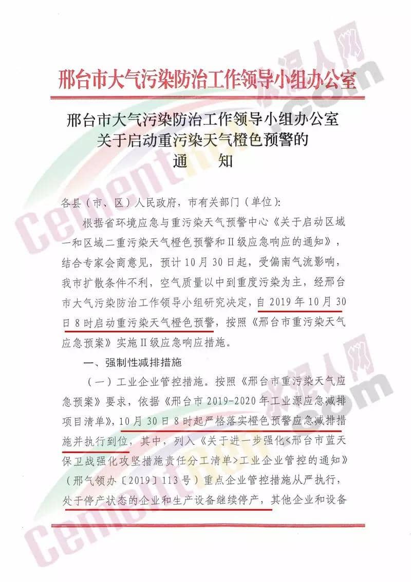 河北邢臺市大氣污染防治工作領(lǐng)導(dǎo)小組辦公室發(fā)布《關(guān)于啟動重污染天氣橙色預(yù)警的通知》要求,自10月30日8時起啟動重污染天氣橙色預(yù)警,按照《邢臺市重污染天氣應(yīng)急預(yù)案》實施II級應(yīng)急響應(yīng)措施。并要求10月30日8時起嚴(yán)格落實橙色預(yù)警應(yīng)急減排措施并執(zhí)行到位,列入《關(guān)于進(jìn)一步強(qiáng)化<邢臺市藍(lán)天保衛(wèi)戰(zhàn)強(qiáng)化攻堅措施責(zé)任分工清單>工業(yè)企業(yè)管控的通知》文件的重點企業(yè)管理措施從嚴(yán)執(zhí)行,處于停產(chǎn)狀態(tài)的企業(yè)和生產(chǎn)設(shè)備繼續(xù)停產(chǎn)。通知原文如下: