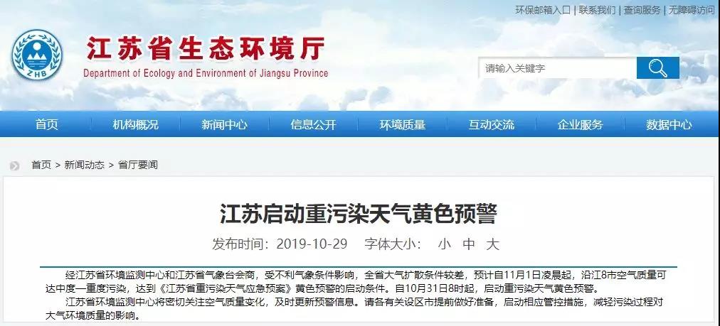江蘇省生態(tài)環(huán)境廳消息:經(jīng)會商,受不利氣象條件影響,江蘇全省大氣擴(kuò)散條件較差,預(yù)計自11月1日凌晨起,沿江8市空氣質(zhì)量可達(dá)中度—重度污染,達(dá)到《江蘇省重污染天氣應(yīng)急預(yù)案》黃色預(yù)警的啟動條件。建議自10月31日8時起,啟動重污染天氣黃色預(yù)警。