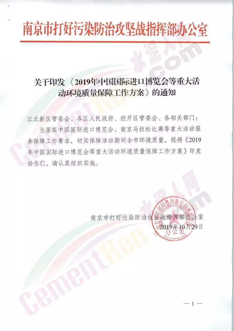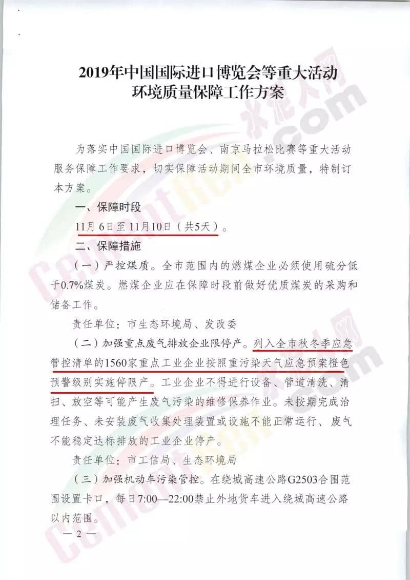 南京市打好污染防治攻堅(jiān)戰(zhàn)指揮部辦公室發(fā)布《2019年中國國際進(jìn)口博覽會(huì)等重大活動(dòng)環(huán)境質(zhì)量保障工作方案》。保障時(shí)段為11月6日至11月10日(共5天)。保障措施包括嚴(yán)控煤質(zhì)及加強(qiáng)重點(diǎn)廢氣排放企業(yè)限停產(chǎn),要求列入全市秋冬應(yīng)急管控清單的1560家重點(diǎn)工業(yè)企業(yè)按照重污染天氣應(yīng)急預(yù)案橙色預(yù)警級(jí)別實(shí)施停限產(chǎn)。全市主城范圍內(nèi)工業(yè)企業(yè)的柴油貨車停止運(yùn)輸和裝卸作業(yè),暫停沙石等易揚(yáng)塵污染的物料運(yùn)輸 ,暫停自卸車傾倒作業(yè)。長江南京靠泊船舶采取使喚用岸電或改燃低硫油等低排放控制措施。暫停長江南京段碼頭和船舶產(chǎn)生大氣污染的裝卸作業(yè),減少大氣污染排放。強(qiáng)化非道路移動(dòng)機(jī)械管控。實(shí)施工地停工,停止所有土方、樁基等易揚(yáng)塵作業(yè),停止渣土運(yùn)輸 。通知原文如下: