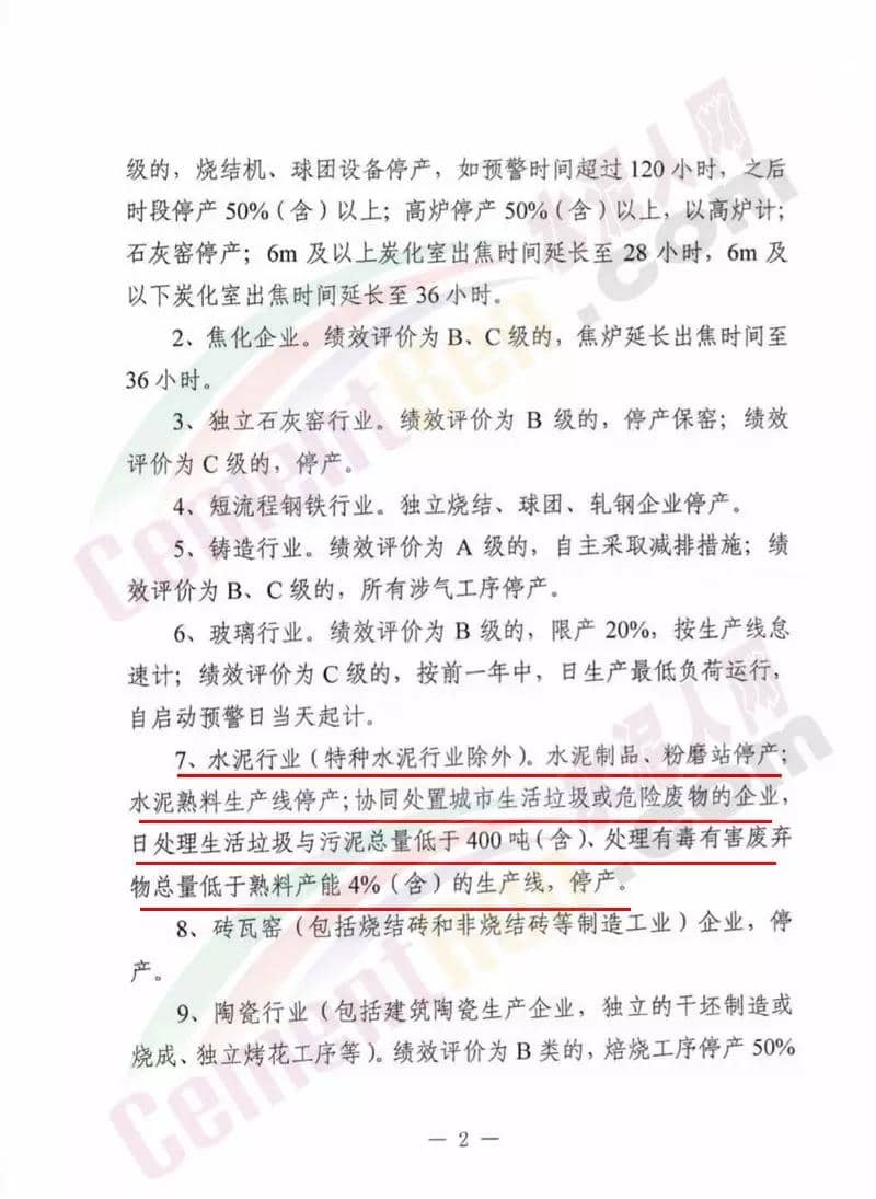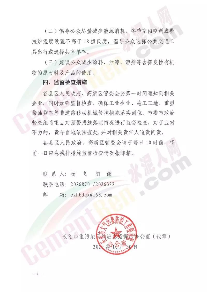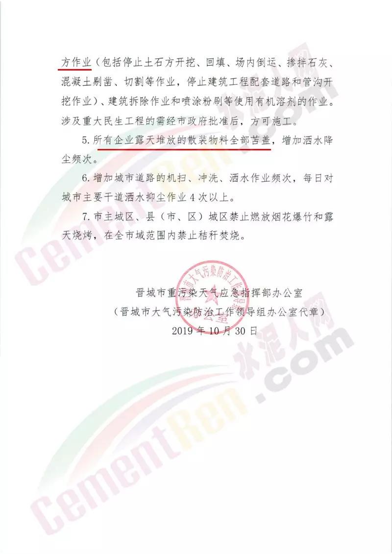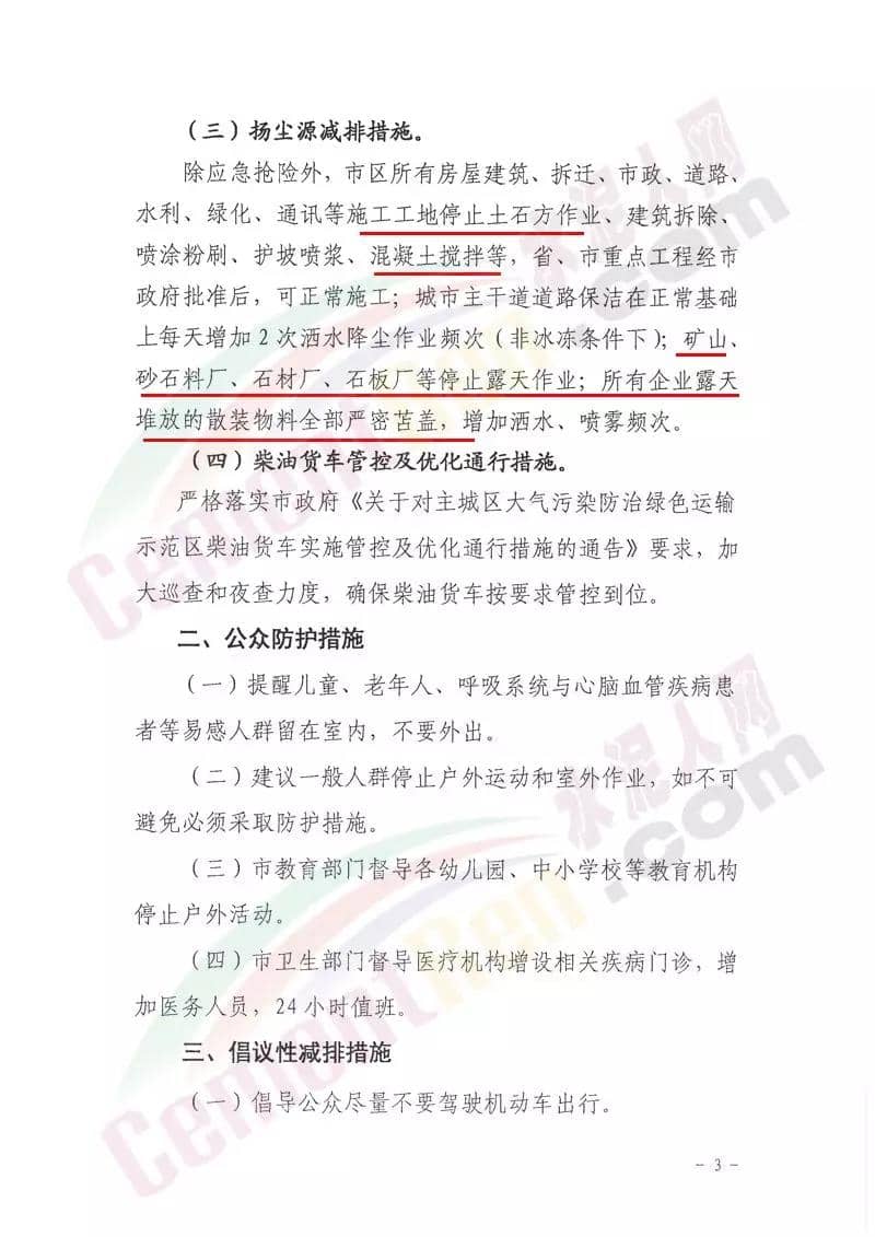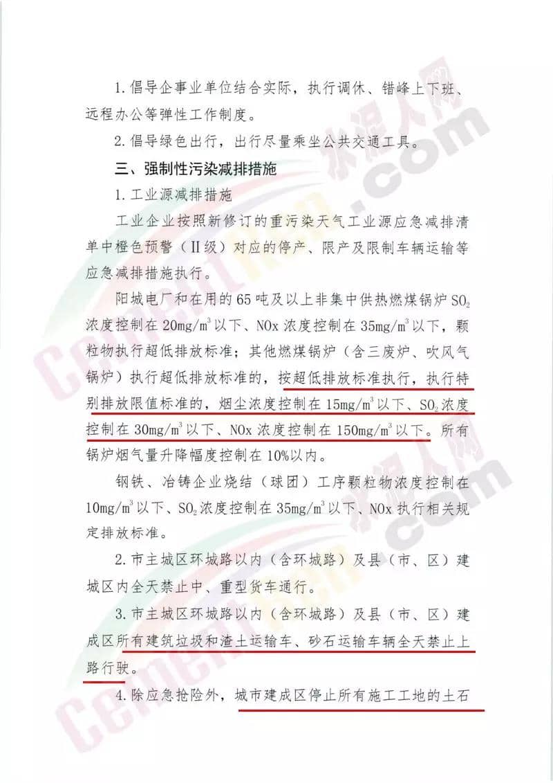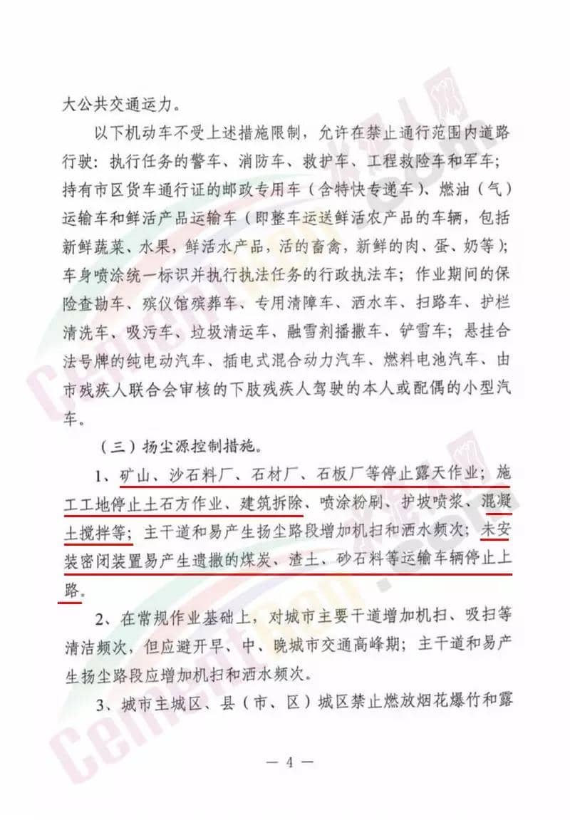 全面落實應急響應減排措施工業源停限產措施。水泥行業(特種水泥行業除外)。水泥制品、粉磨站停產;水泥熟料生產線停產;協同處置城市生活垃圾或危險廢物的企業,日處理生活垃圾與污泥總量低于400噸(含)、處理有毒有害廢棄物總量低于熟料產能4%(含)的生產線,停產。移動源限行措施。1、施工工地、工業企業廠區和工業園區內應停止使用國二及以下非道路移動機械。2、市中心城區環城路以內以及各縣(市)區城區,每天7時至20時禁止大型貨車(含持有通行證)、三輪汽車、低速載貨汽車通行,禁止建筑垃圾和渣土運輸車、砂石運輸車輛上路行駛。3、礦山、洗煤廠、港口、物流(除民生保障類)等涉及大宗原料和產品運輸(日常車輛進出量超過10輛)的單位禁止使用國四及以下重型載貨汽車(含燃氣)進行運輸。4、工業企業移動源限行措施執行《關于印送〈關于加強重污染天氣應對夯實應急減排措施的指導意見〉的函》(環辦大氣函〔2019〕648號)相關條款。揚塵源控制措施。礦山、沙石料廠、石材廠、石板廠等停止露天作業;施工工地停止土石方作業、建筑拆除、噴涂粉刷、護坡噴漿、混凝土攪拌等;主干道和易產生揚塵路段增加機掃和灑水頻次;未安裝密閉裝置易產生遺撒的煤炭、渣土、砂石料等運輸車輛停止上路。通知原文如下:
