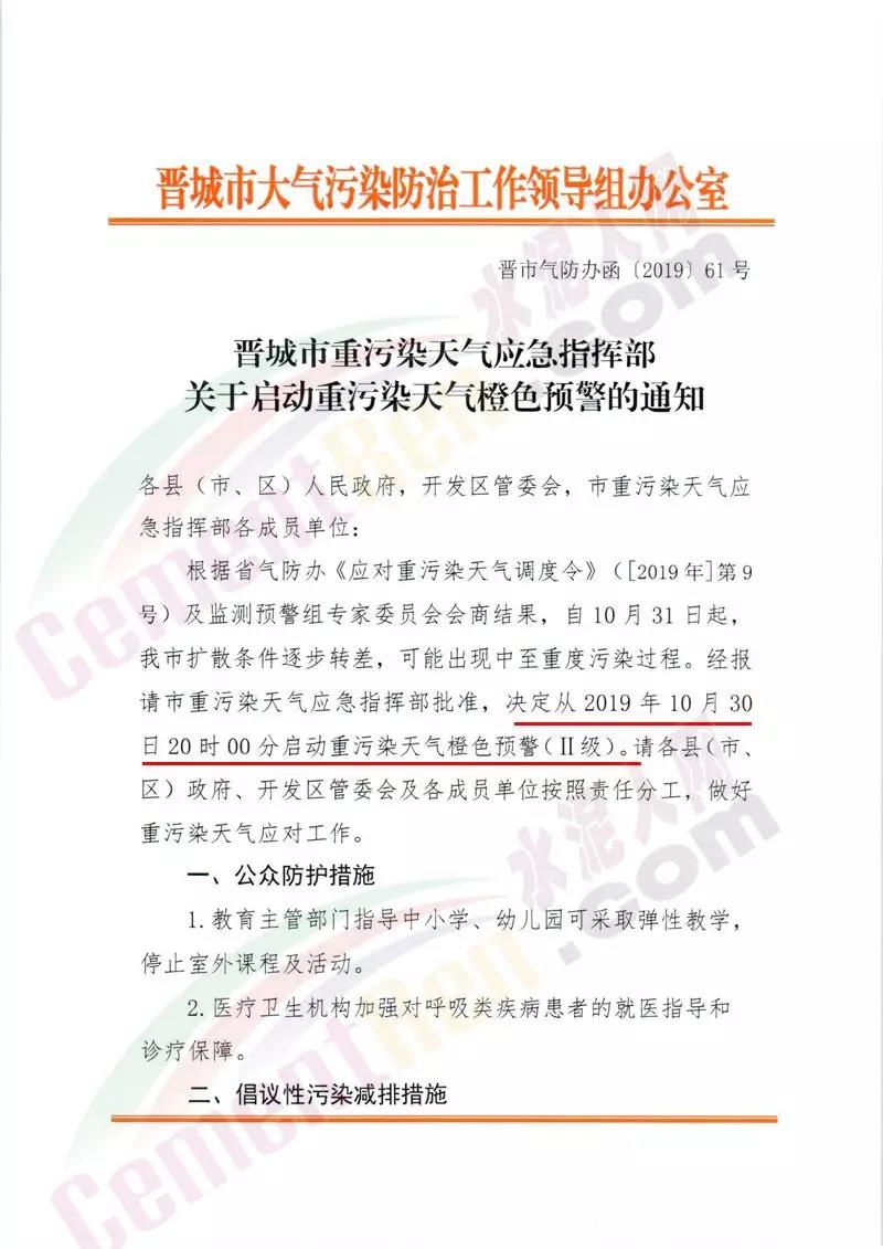 晉城市大氣污染防治工作領導組辦公室發布《晉城市重污染天氣應急指揮部關于啟動重污染天氣橙色預警的通知》稱:從10月30日20時啟動重污染天氣橙色預警(II級)。