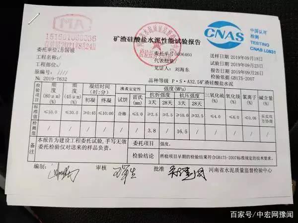 根據河南省水泥質量監督檢驗中心出具的實驗報告,送檢水泥樣本強度符合標準規定的技術要求。