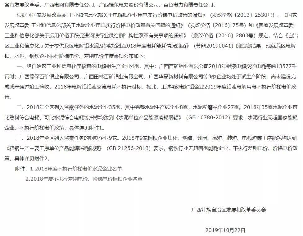 水泥人網(wǎng)消息:日前,廣西壯族自治區(qū)發(fā)改委發(fā)布《廣西壯族自治區(qū)發(fā)展和改革委員會關于我區(qū)電解鋁水泥鋼鐵企業(yè)執(zhí)行階梯電價差別電價有關事項的通知》稱: 2018年全區(qū)列入監(jiān)察任務的水泥企業(yè)35家,其中完整水泥生產(chǎn)線企業(yè)8家,水泥粉磨站企業(yè)27家。2018年35家水泥企業(yè)可比熟料綜合電耗、可比水泥綜合電耗等指標均達到《水泥單位產(chǎn)品能源消耗限額》(GB 16780-2012)要求,水泥行業(yè)無超國家能耗企業(yè),不執(zhí)行階梯電價政策。
