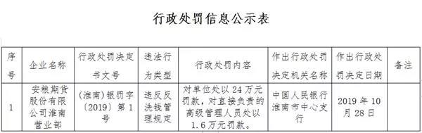 中國人民銀行合肥中心支行網站近日公布的人民銀行淮南市中心支行轄內行政處罰信息公示表((淮南)銀罰字〔2019〕第1號)顯示,安糧期貨股份有限公司淮南營業部(以下簡稱:“安糧期貨淮南營業部”)違反反洗錢管理規定,中國人民銀行淮南市中心支行依法作出對其處以24萬元罰款,對直接負責的高級管理人員處以1.6萬元罰款的決定。