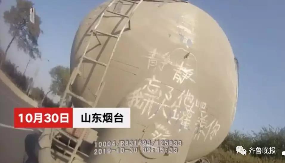 近日,山東煙臺一輛罐車滿身泥垢,上面還寫著幾行字:“靜靜,忘了他吧,我開大罐(車)養你。”
