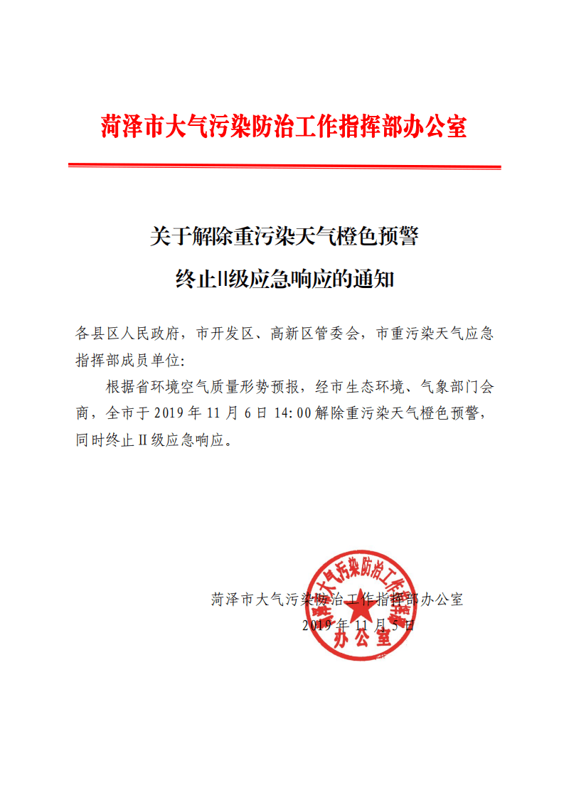 水泥人網消息:昨日(11月5日)山東、江蘇、河北等多個區域陸續解除重污染天氣預警和降低預警級別。山東省荷澤市其中,山東省菏澤市大氣污染防治工作指揮辦公室發布了《關于解除重污染天氣橙色通知預警終止二級應急響應的通知》稱:根據省環境空氣質量形勢預報,經市生態環境、氣象部門會商,全市于2019年11月6日14時解除重污染天氣預警,同時終止二級應急響應。