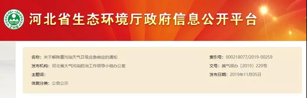 11月5日,河北省生態環境廳發布關于解除重污染天氣Ⅱ級應急響應的通知。按照《河北省重污染天氣應急預案》要求,區域二城市(唐山、廊坊、滄州、秦皇島)于11月7日8時解除重污染天氣Ⅱ級應急響應;區域一城市(石家莊、保定、衡水、邢臺、邯鄲、定州、辛集、雄安新區)于11月10日8時解除重污染天氣Ⅱ級應急響應。