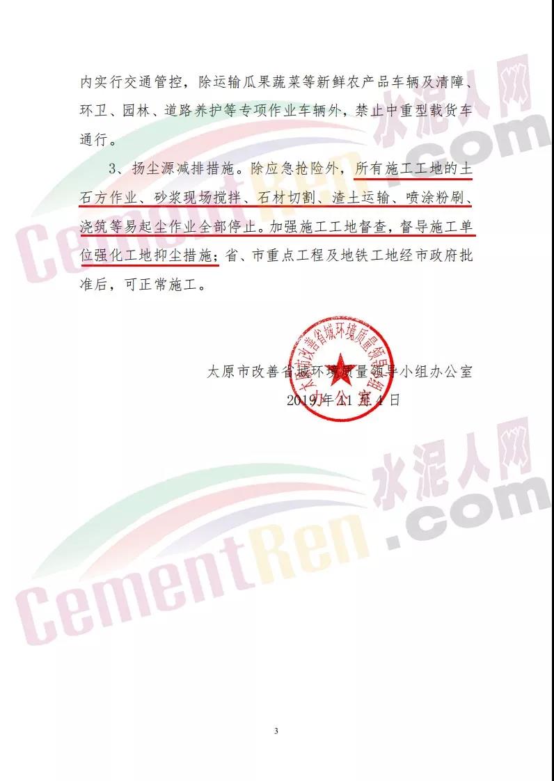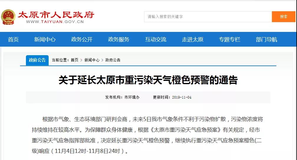 水泥人網消息:日前,太原市人民政府發布了《關于延長太原市重污染天氣橙色預警的通告》稱:根據太原市氣象、生態環境環境部門研判會商,未來5日太原市氣象條件不利于污染物擴散,污染物濃度將持續維持在較高水平,為保障群眾身體健康,根據《太原市重污染天氣應急預案》有關規定,經太原市重污染天氣應急指揮部批準,決定延長重污染天氣預警,繼續執行重污染天氣應急預案橙色二級響應(11月4日12時-11月8日24時)。通告原文如下: