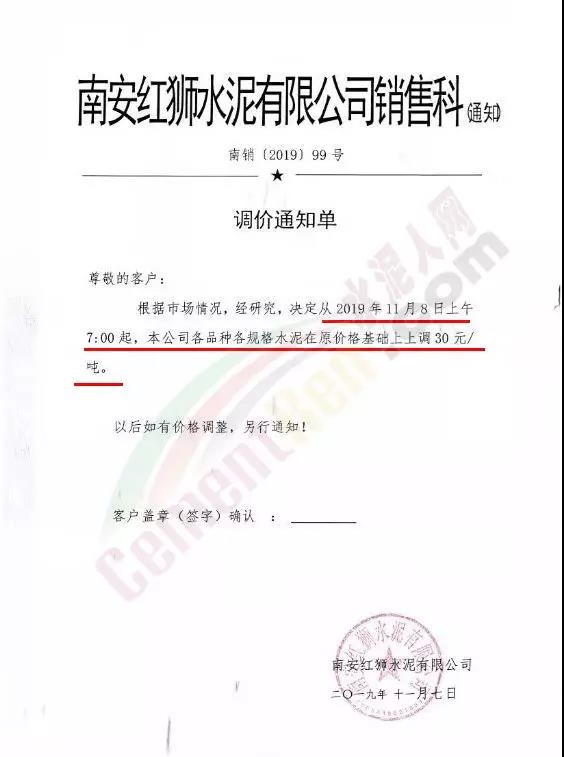 根據市場情況,經研究,決定從2019年11月8日零時起,本公司發往福建省內各品種各規格型號水泥在原價格基礎上上調30元/噸。