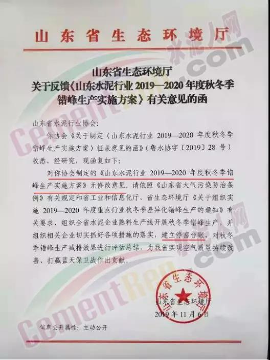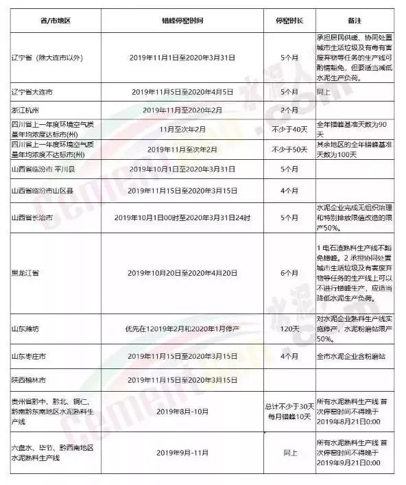 晉冀魯豫(京津冀2+26城市)即將停窯11月6日山東省水泥行業協會收到山東省生態環境廳的復函稱對其提交的2019-2020采暖季錯峰生產計劃方案無修改意見。山東省區域內熟料生產企業從2019年11月15日0時-2020年3月15日24時實施錯峰生產。其中2018年11月15日-2019年10月31日期間,積極落實秋冬季錯峰生產、夏季錯峰生及各市統一組織的環境污染減排任務,錯峰生產總時間超過160天的企業,可按照實際超出天數延遲錯峰生產,但最遲應于2019年12月1日0時開始實施錯峰生產。據山東省65家熟料生產企業中有45家企業可延遲實施錯峰生產,山東水泥廠、棗莊中聯水泥等于11月30日起停限產,泰安中聯、濟寧中聯、濟寧山水、臨沂中聯等自2019年12月1日起停限產。