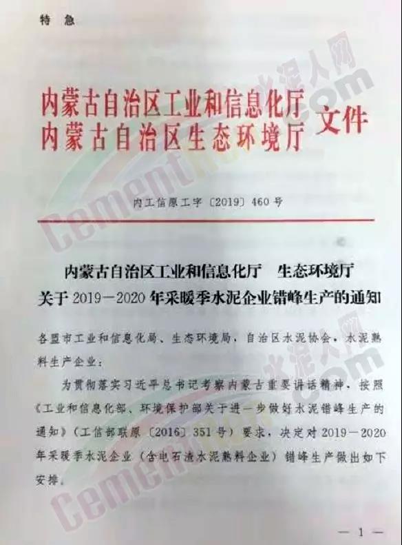 11月6日,內蒙古自區工信廳聯合自治區生態環境廳一起發布特急文件《關于2019-2020年采暖季水泥企業錯峰生產的通知》。文件要求內蒙古自治區境內所有水泥熟料生產企業包括利用電石渣生產水泥熟悉的企業停限產。且鼓勵水泥熟料企業在自愿的前提下,延長增加錯峰生產的時間。2019年至2020年度錯峰生產時間為2019年11月15日至2020年3月15日共4個月全面實行錯峰生產。