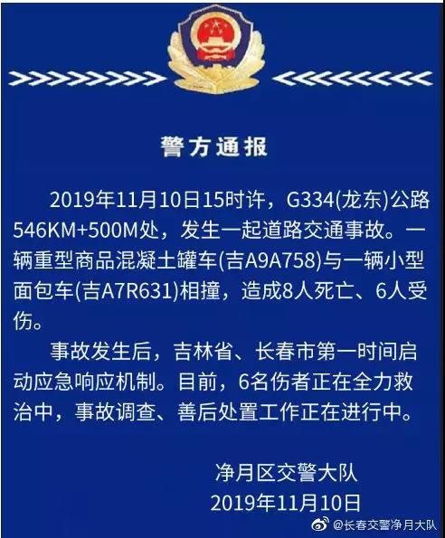 吉林省長春市凈月區交警大隊通報稱:2019年11月10日15時許,G334(龍東)公路546KM+500M處,發生一起道路交通事故。一輛重型商品混凝土罐車(吉A9A758)與一輛小型面包車(吉A7R631)相撞,造成8人死亡、6人受傷。 事故發生后,吉林省、長春市第一時間啟動應急響應機制。目前,6名傷者正在全力救治中,事故調查、善后處置工作正在進行中。 通報原文如下: