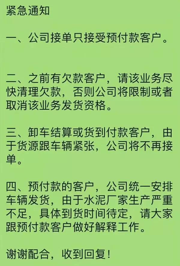 日前,山西省區域某水泥企業發出緊急通知稱,公司只接受預付款客戶,之前欠款客戶未清理欠款的將限制或取消發貨資格,卸車結算或貨到付款客戶,由于貨源、車輛緊張,公司將不再接單。預付款的客戶公司統一安排車輛發貨,由于水泥廠家生產嚴重不足,具體到貨時間待定。