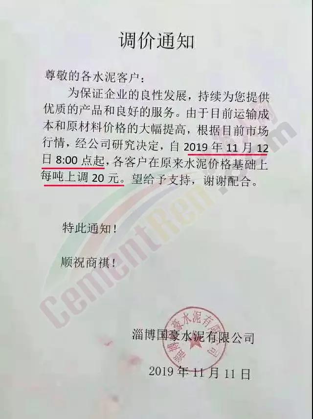 淄博國豪水泥有限公司調價通知稱,由于目前運輸成本和原材料價格的大幅提高,根據目前市場行情,經公司研究決定,自11月12日早8時起,在原來水泥價格基礎上每噸上調20元。