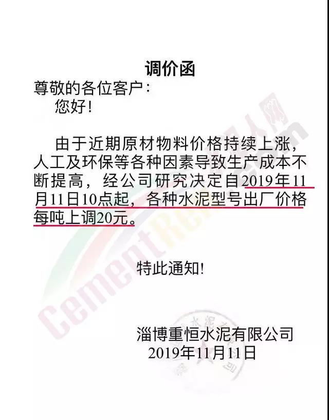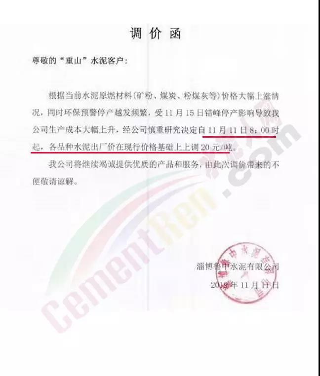 泥原燃材料(礦粉、煤炭、粉煤灰等)價格大幅上漲情況,同時環保預警停產越發頻繁,受11月15日錯峰停產影響導致公司生產成本大幅上升,經公司慎重研究決定 自11日早8時起,各品種水泥出廠價在現行價格基礎上上調20元/噸。