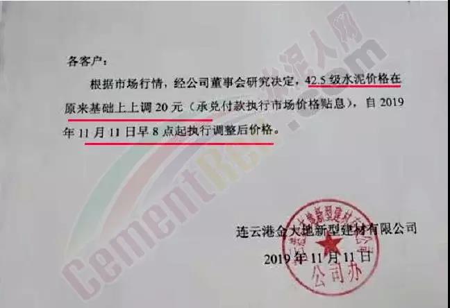 昨日江蘇多家企業通知上調水泥價格。其中連云港金大地新型建材有限公司通知,42.5級水泥自11月11日早8點起上調20元/噸。