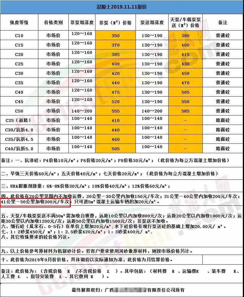 廣西區域某混凝土企業11月11日報價顯示距離 41-50公里加收300元/方。C30非泵送報價最高420元/m³。與廣區江門地區價格相差210元/m³。