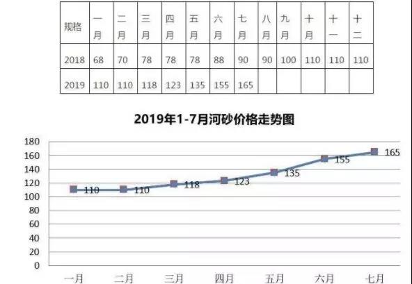 在湖北黃岡,河砂價格從2018年1月的每噸68元上漲到今年7月的165元,上漲幅度高達143%;