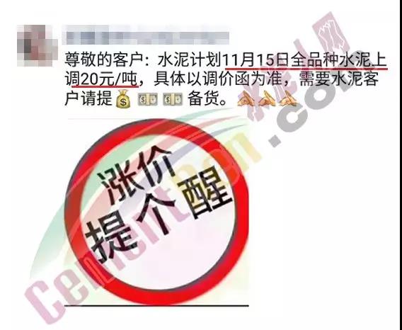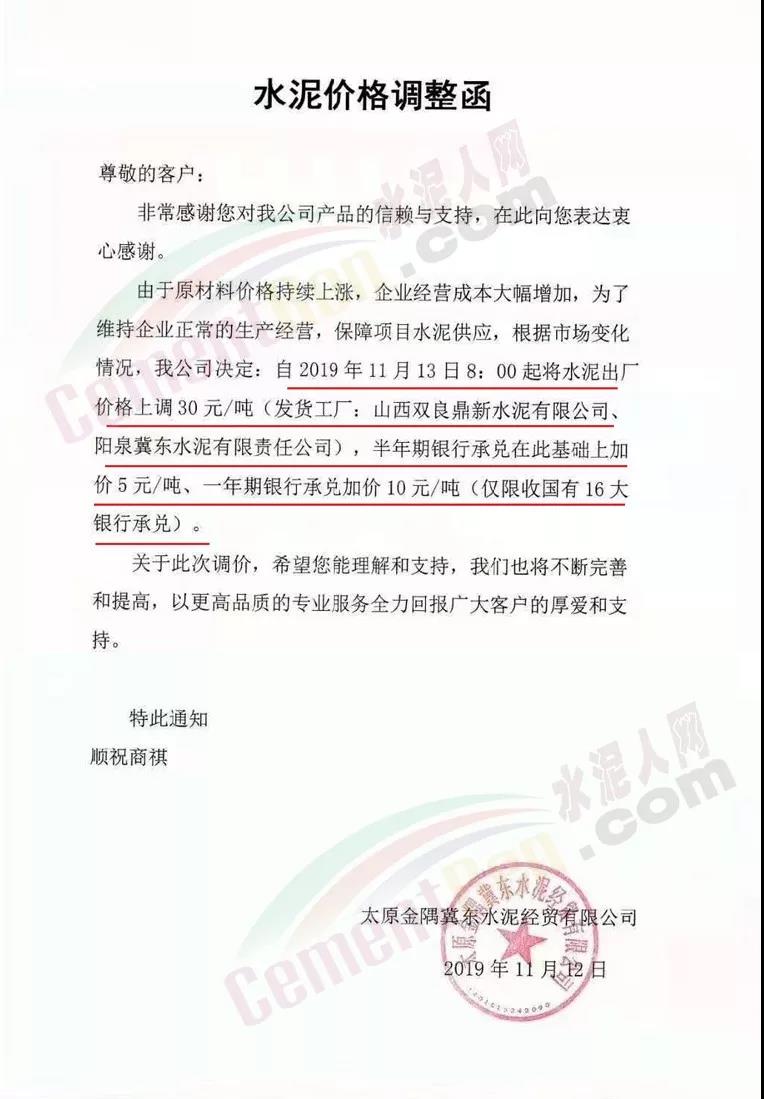 太原金隅冀東水泥調價通知稱:由于原材料價格上漲,企業經營成本大幅增加,為了維持企業正常的生產經營,保障項目水泥供應,根據市場變化情況,公司決定自11月13日早8時起將水泥出廠價格上調30元/噸。發貨工廠分別為山西雙良鼎新水泥有限公司、陽泉冀東水泥有限責任公司。