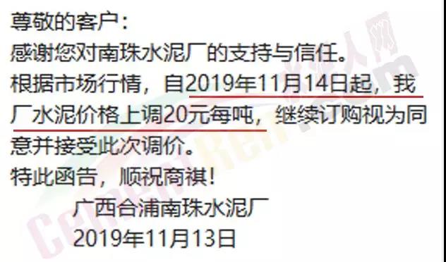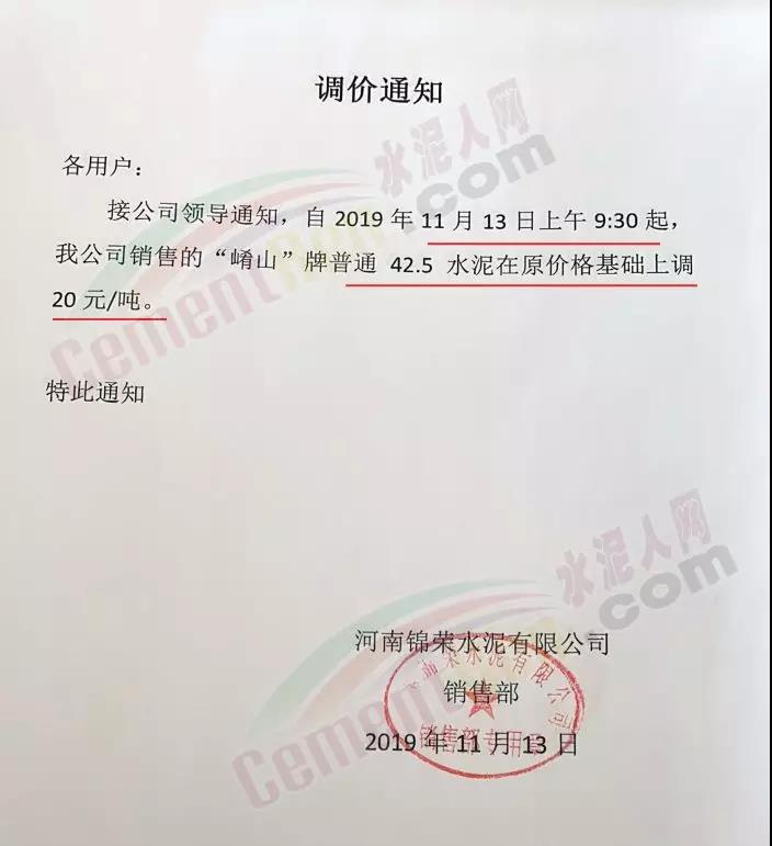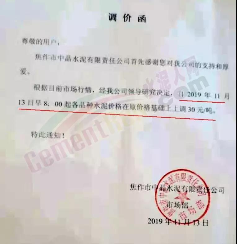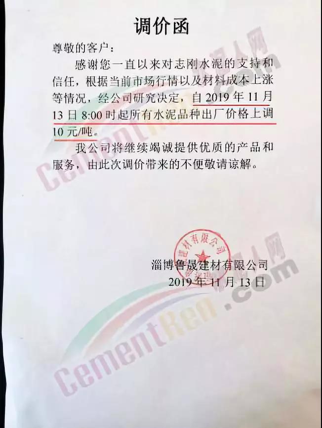 淄博魯晟建材有限公司通知自11月13日早8時起所有水泥出廠價格上調10元/噸。