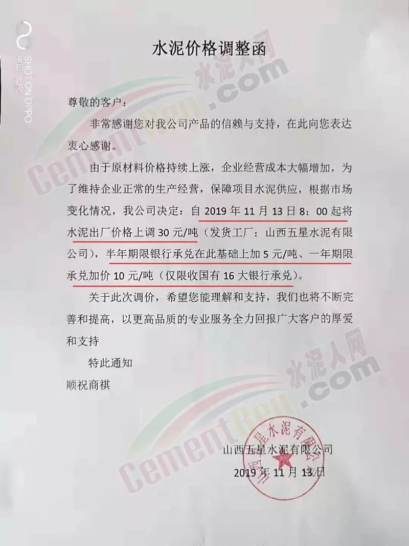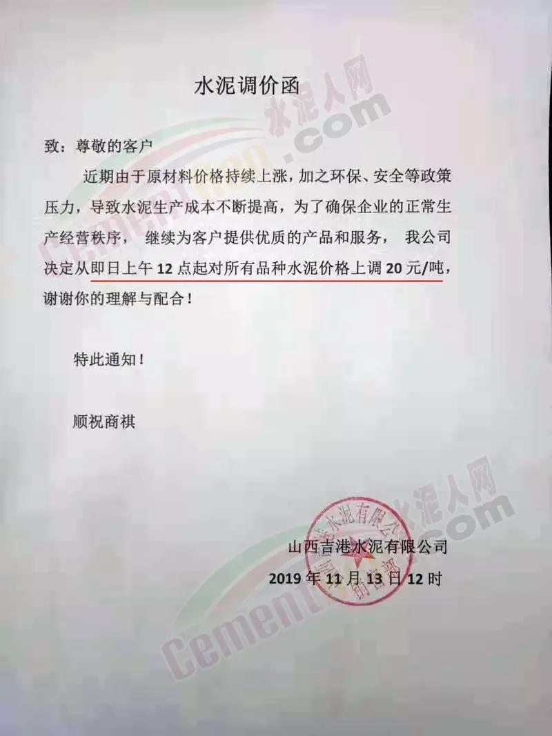 太原山水水泥有限公司水泥價格調整通知函稱,由于近期市場變化和環保嚴峻的形勢影響,原材料成本不斷上升、人工成本增加,企業經營成本大升。為保證公司維持正常經營狀態,公司決定于11月13日8時起將公司P.O42.5散裝水泥出廠價在原有的基礎上上調30元/噸。