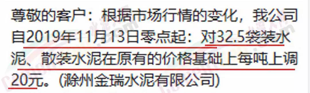 安徽滁州金瑞水泥有限公司通知32.5袋裝、散裝水泥上調20元/噸。