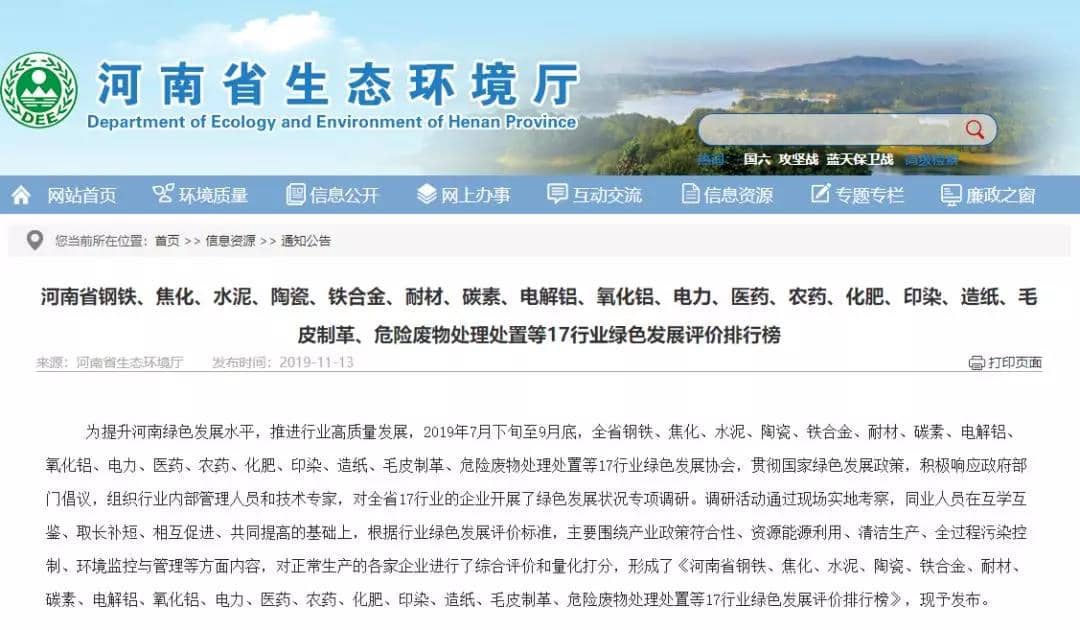 日前,河南省生態環境廳發布《關于2019年度綠色環保引領企業名單的公示》稱:根據《河南省綠色環保調度制度實施方案(試行)》(豫環文〔2018〕280號),省生態環境廳、省發展改革委、省工業和信息化廳、省財政廳、省金融辦等部門,組織相關行業、領域專家,對各省轄市推薦申報的2019年度綠色環保引領企業進行了資料復核、現場核驗、集中評選,確定了2019年度綠色環保引領企業名單,并予以公示, 接受公眾監督。公示期間,接受反映有關企業存在問題的來信、來訪和來電。公示時間:2019年11月12日至11月18日。詳情如下: